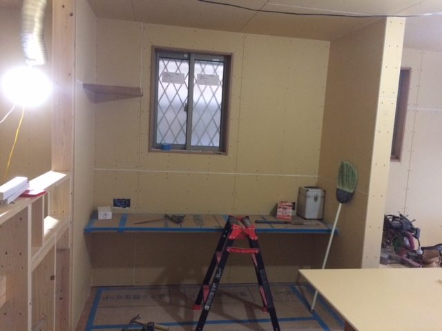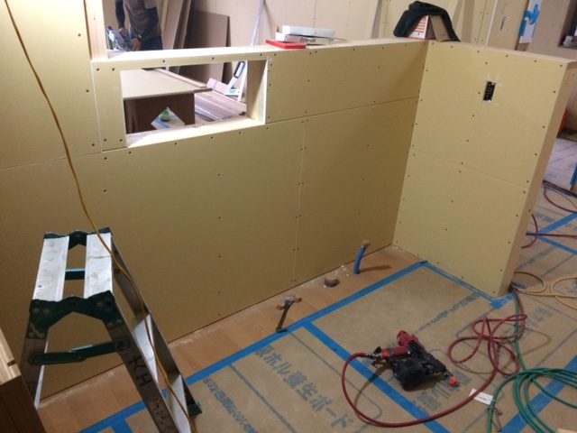 天井・壁とも下地ボードが貼り終わり床のフローリングの施工も完了です!