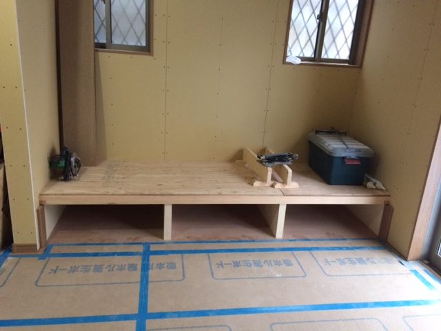 フローリングは貼り終わった段階ですぐ養生ボードというクッション性のあるボードを貼ります、これで作業中に何かものを落としたり衝撃が加わってもフロアを傷めずに済みます![]()