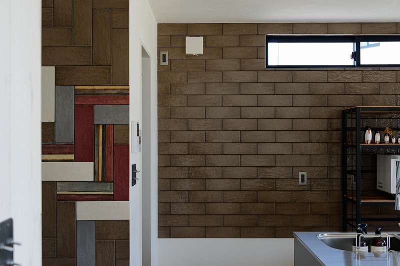 壁と天井には自然素材の「幻の漆喰」を使用。コストを抑えた防音室に、インダストリアルテイストなリビング、印象に残るタイル壁やこだわりのヘリンボーンの床などインダストリアルテイストなお宅となっております。
