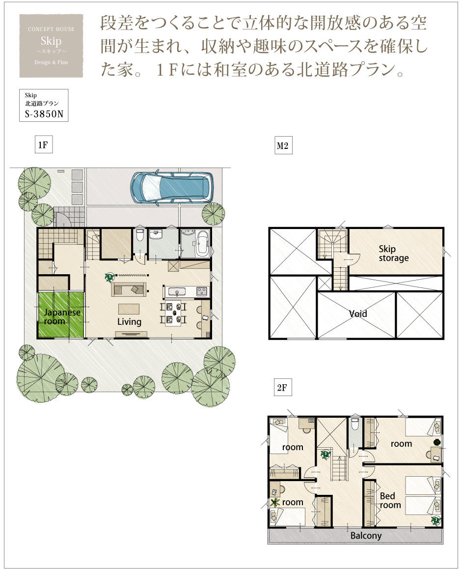 北道路・中2階/延床面積約40坪☆岡山で木造住宅を建てるなら!サンオリエントの新築住宅プランNo.22☆たっぷり収納スペースのある家「スキップ」