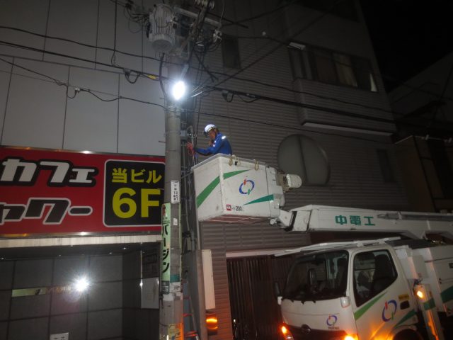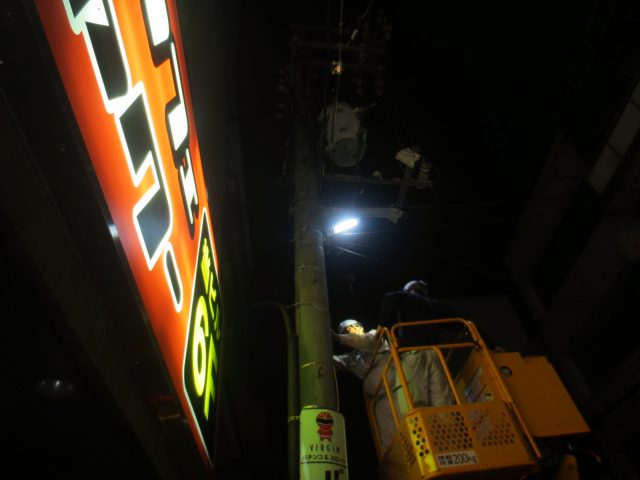 引込はビルの営業に負担にならない様、停電作業は24時からの予定でしたが、お店の残業が出たため、24時30分から開始となりました。