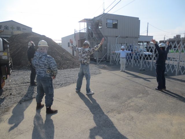 ▼住宅の現場とは違って、朝礼前にラジオ体操をします。