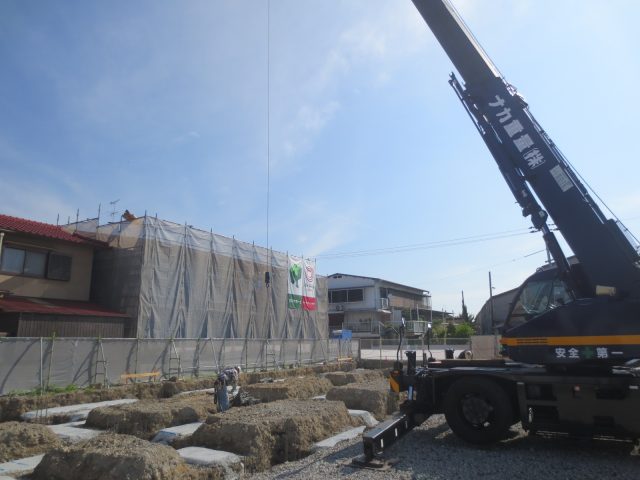▼鉄筋を配るにもクレーンを使って配ります、この現場は未だ比較的小さいので小さいクレーンですが、大きな現場では25tのクレーンが一般的です、それでも届かない場合や、高層の建物になるとタワークレーンを建てますね。