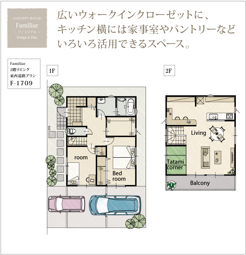 今回は2階リビング・ 2LDK・畳コーナーに広いバルコニー・キッチン横には家事室としてもパントリーとしても利用可能なスペースのある F-1709 をご紹介☆