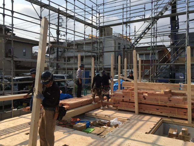 先日15日無事棟上げを行う事が出来ました、現在は大工さんが金物の取付や、筋違・間柱の取付を行っています。
