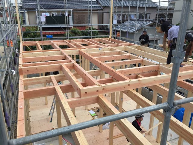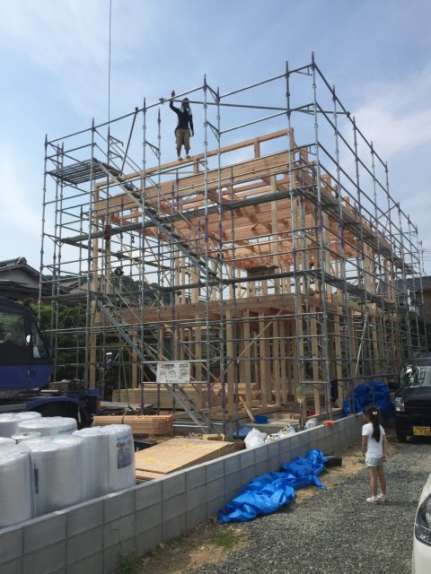 早いですね~と驚きつつ近くの山本邸で打合せ、お昼には2階が完成、午後からは小屋部分と屋根の組立です。