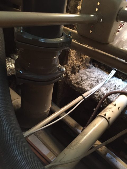 塔屋の電気室に雨漏れ発生、原因は配管のつまりのようです。