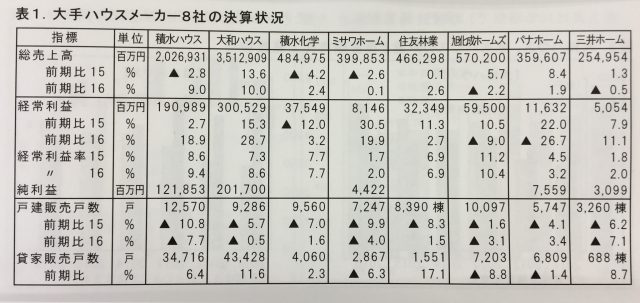 2016年の前期比では積水化学、住友林業、パナホーム以外は戸建て販売戸数を前期比で落としています。