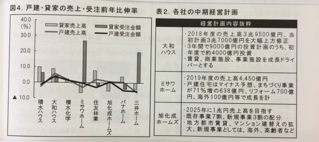 次に大手各社の戸建てと賃貸の売り上げの関係、及び大和ハウス、ミサワホーム、旭化成ホームズの中期経営計画です。