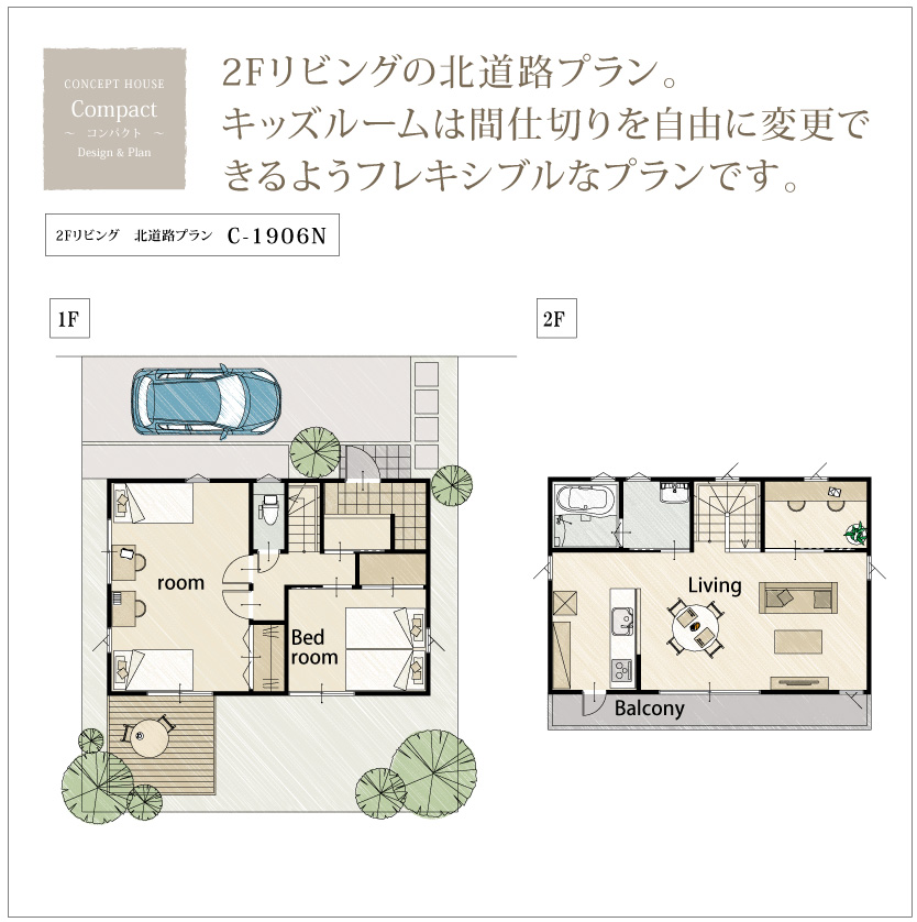 こちらは2LDKですが、2階のキッズルームはフレキシブルタイプとなっており、お子様の成長にあわせて間仕切りの変更が可能です。