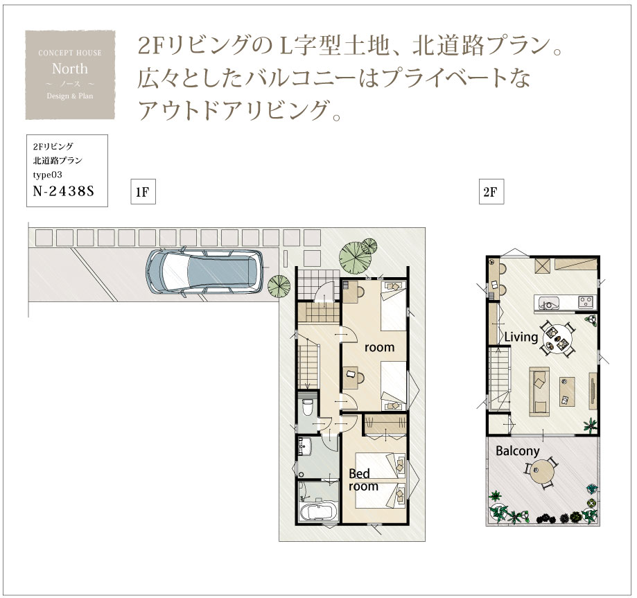 北道路(旗竿地)の特徴を最大限活かすプランの中で、一番の特徴は誰にも邪魔されることのないプライベートなアウトドアリビングとして設けられている 広々としたバルコニー がある、L字型土地のプラン N-2438S☆