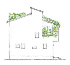 物干しはもちろん、植物園のような植栽を楽しめるバルコニーテラス。建物の内側に庭を取り込んだ家。グリーンゲージを設けた住まいです。