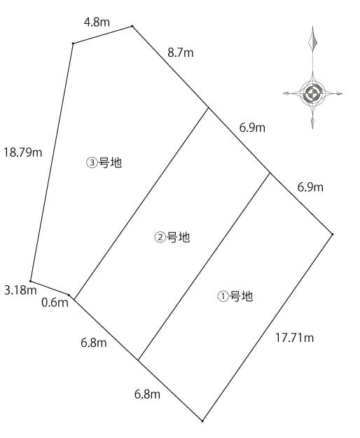 ②この土地はもとは一軒のお家が建っていたところを3分割する計画です。
