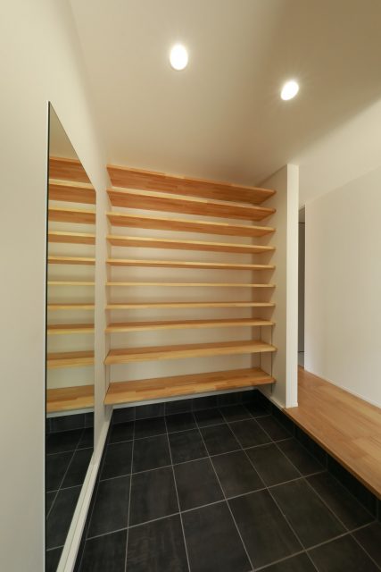 ・家族は玄関横のシューズクロークから出入りできるので、急な来客でも靴の出しっぱなしがなく、スッキリとした玄関。洗面やWICがおでかけや帰宅後の動線上にありますので、身支度がしやすいです。