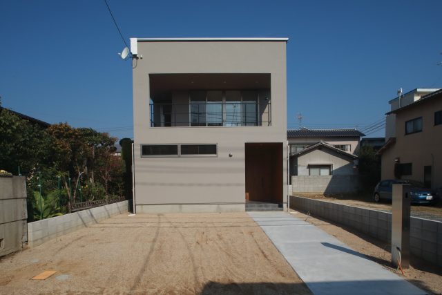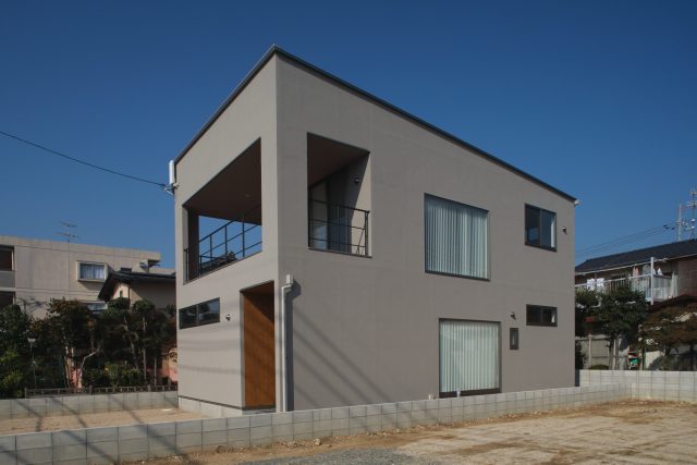 1階リビングなら、コの字で中庭のある設計、2階リビングなら、道路からの視線は気にしなくていいかなと考えていましたが、広いバルコニーがご希望とお聞きし、必然的に2階リビングから始まりました。