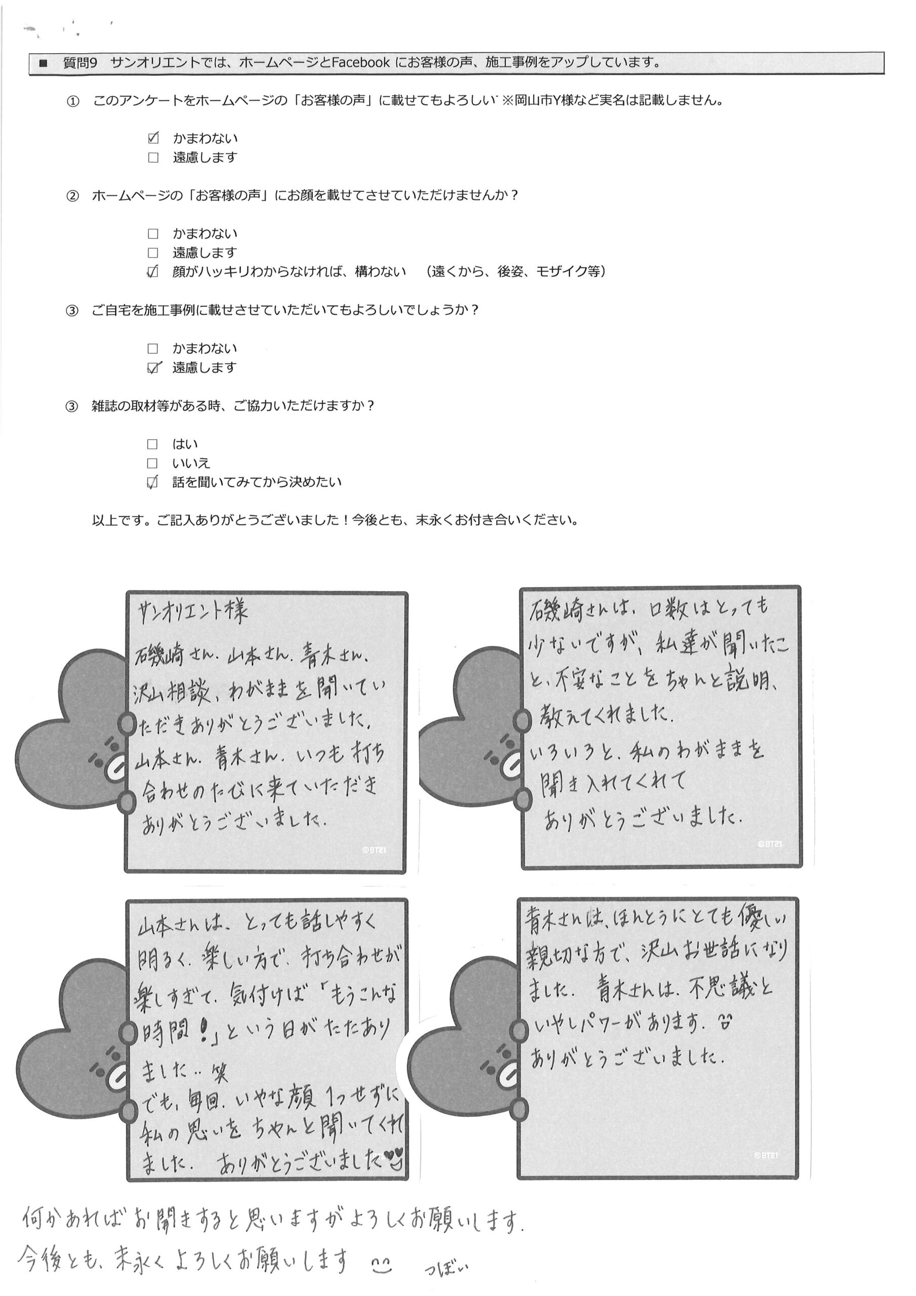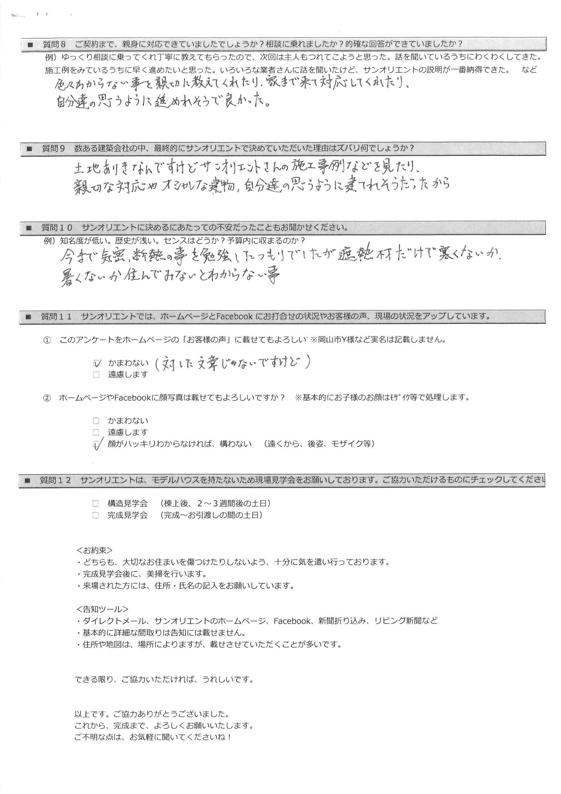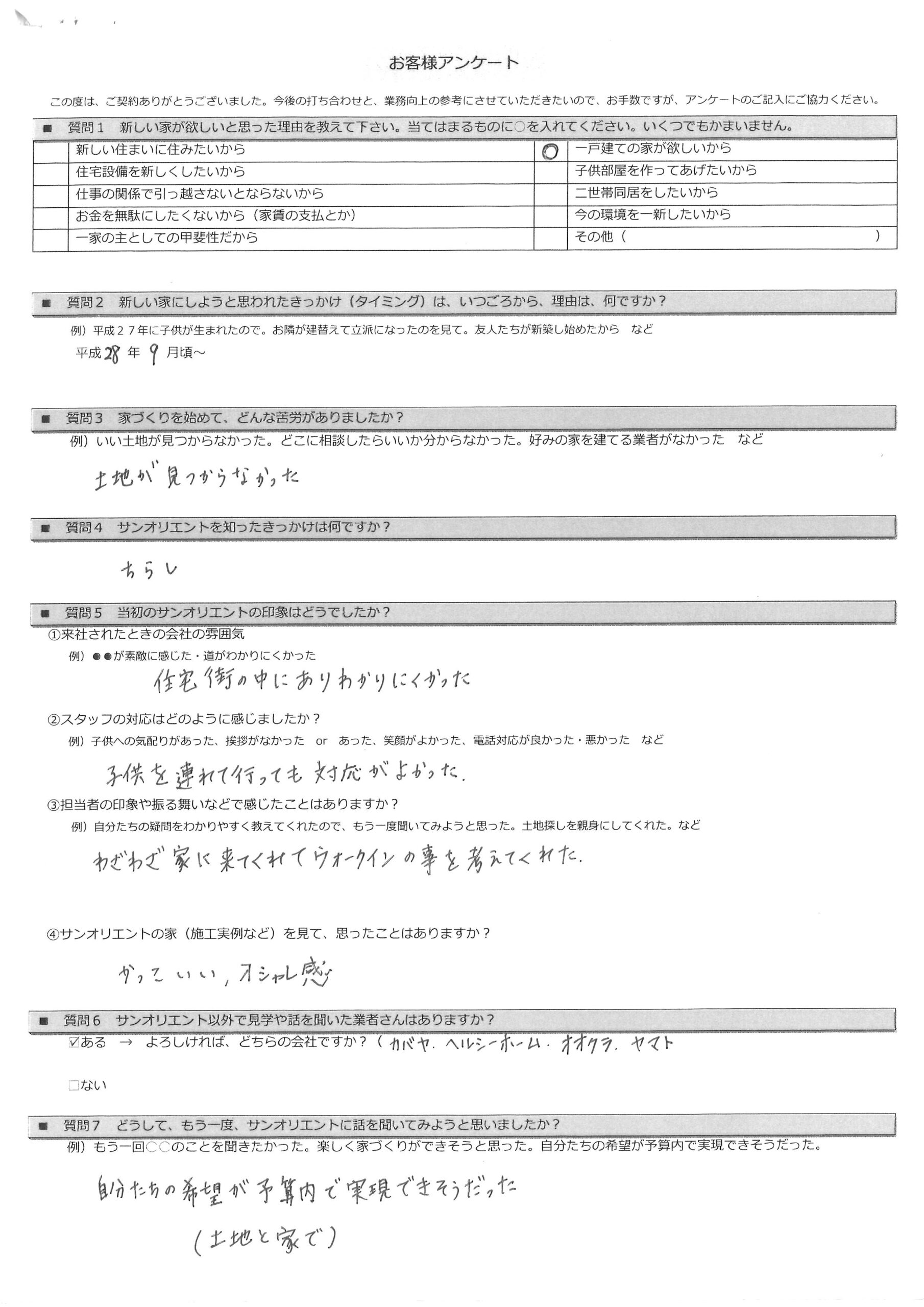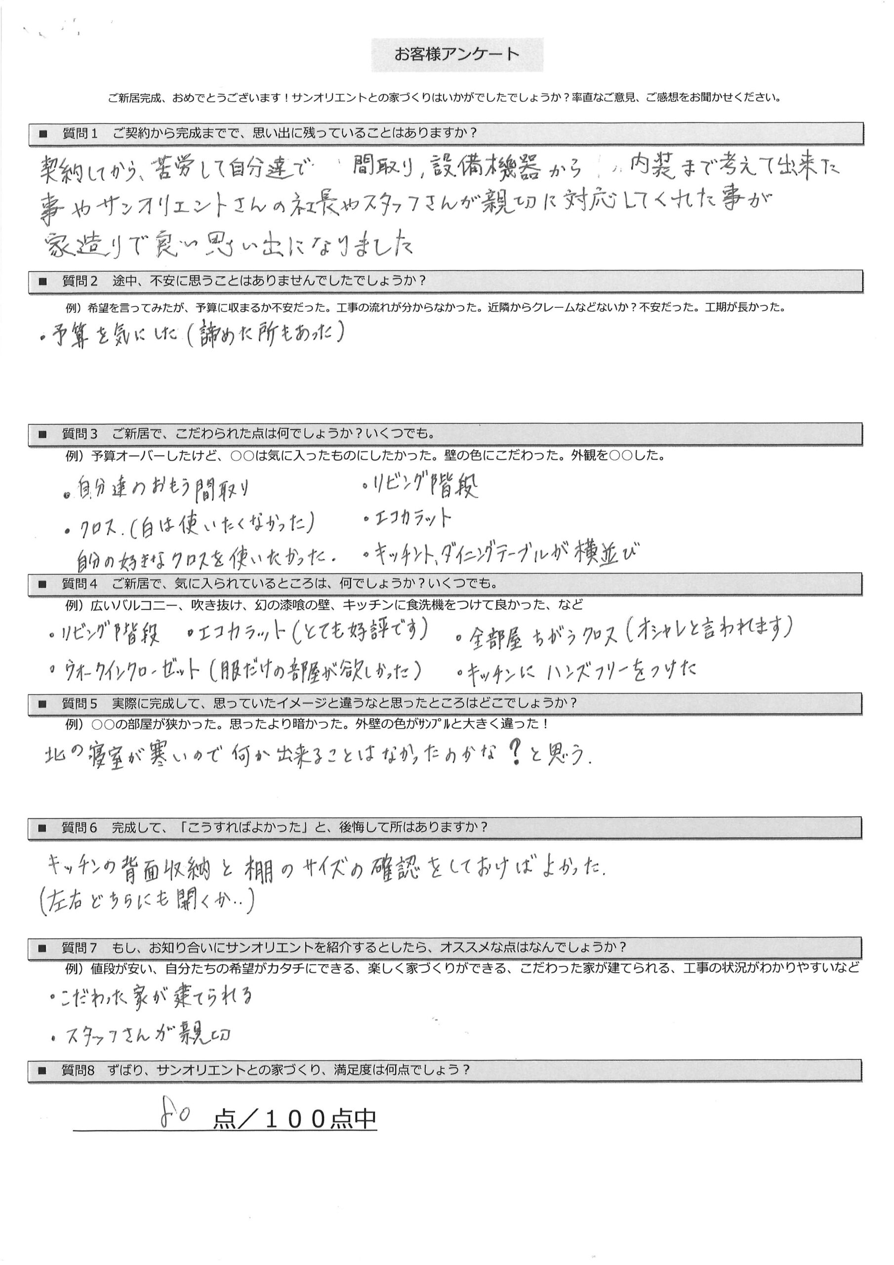 「契約してから、苦労して自分たちで、間取り・設備機器・内装まで考えてできたことやサンオリエントさんの社長やスタッフさんが親切に対応してくれたことが家づくりで良い思い出になりました。