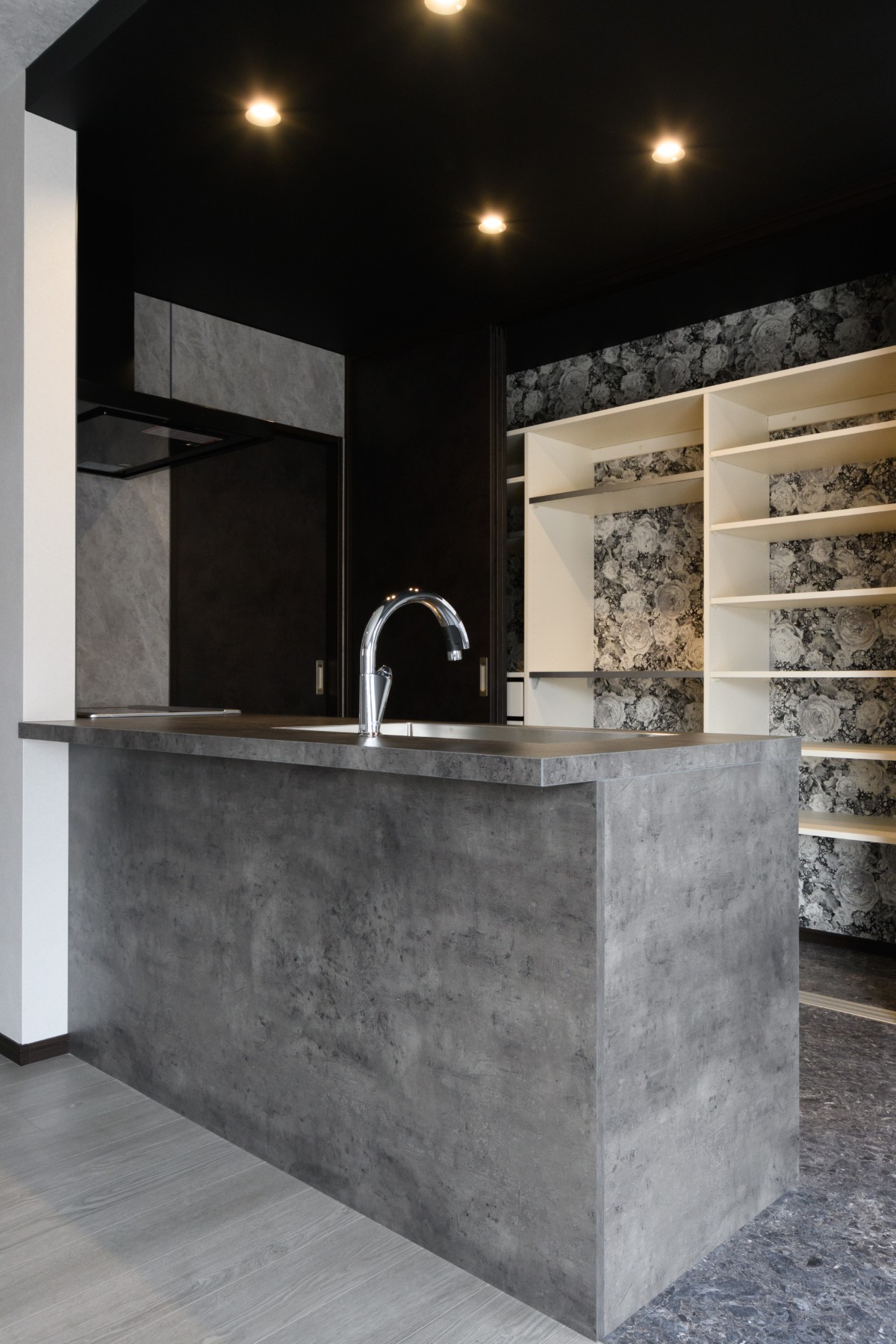 ▼黒い天井と黒い扉ですが、扉を開けるとゴージャスな花柄のクロス