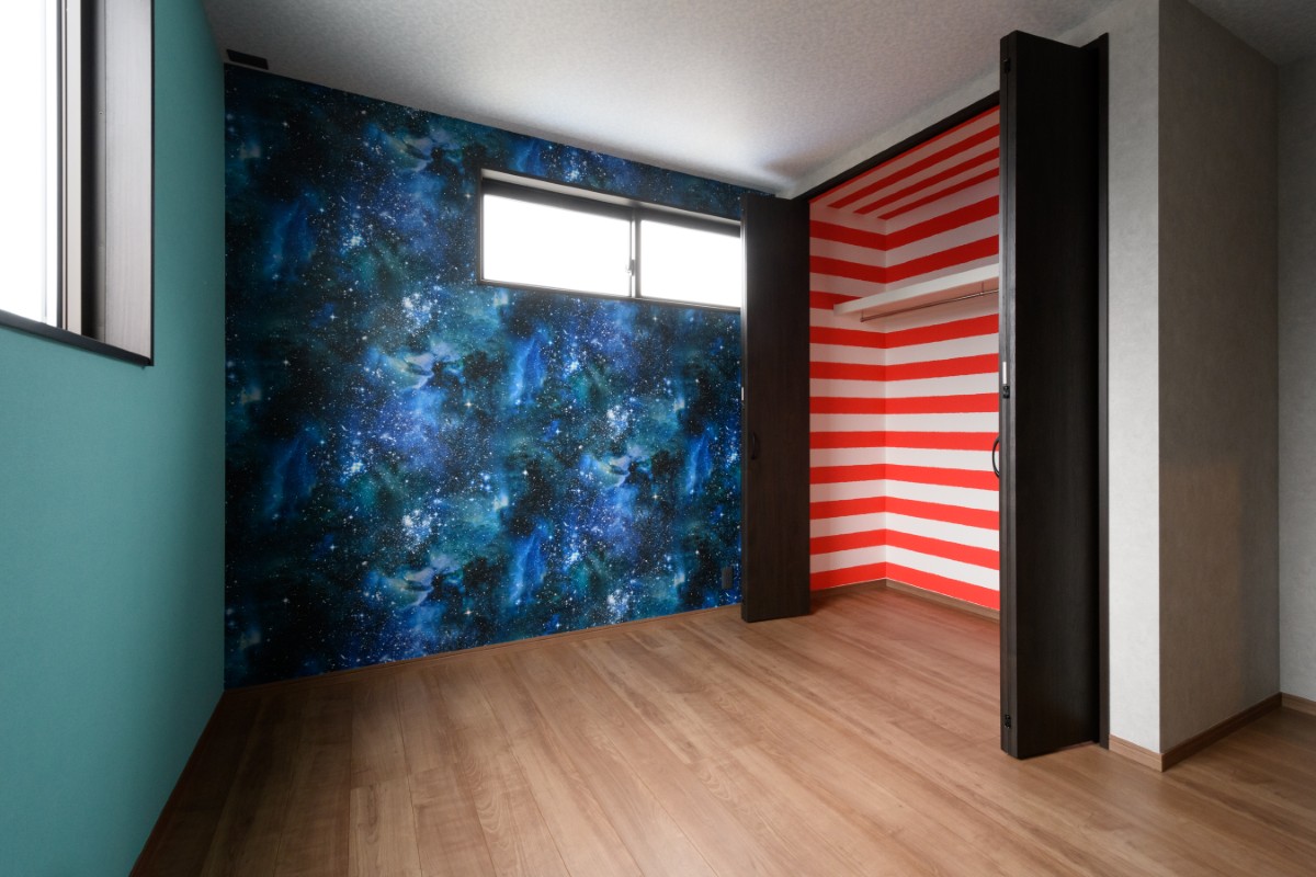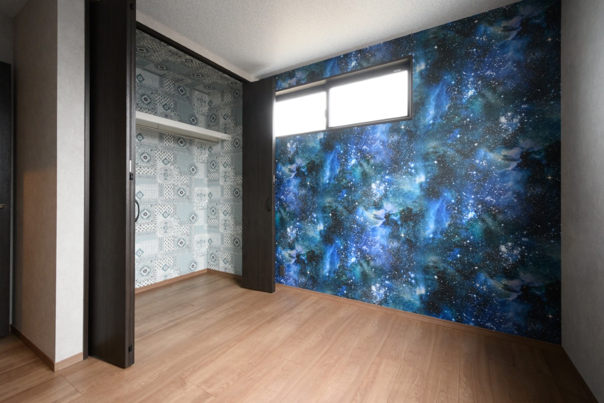 ▼楽しい気分になるクロスを貼ったウォークインクローゼット