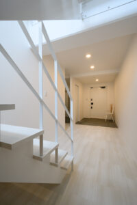 鉄骨で造った階段も、現場を解体してから納まりを見て、現場監督の丸尾と職人さんとで苦労して制作した、この物件の一番の見せ場であり、コンクリートの建物を扱っていないとできない技が隠れています。