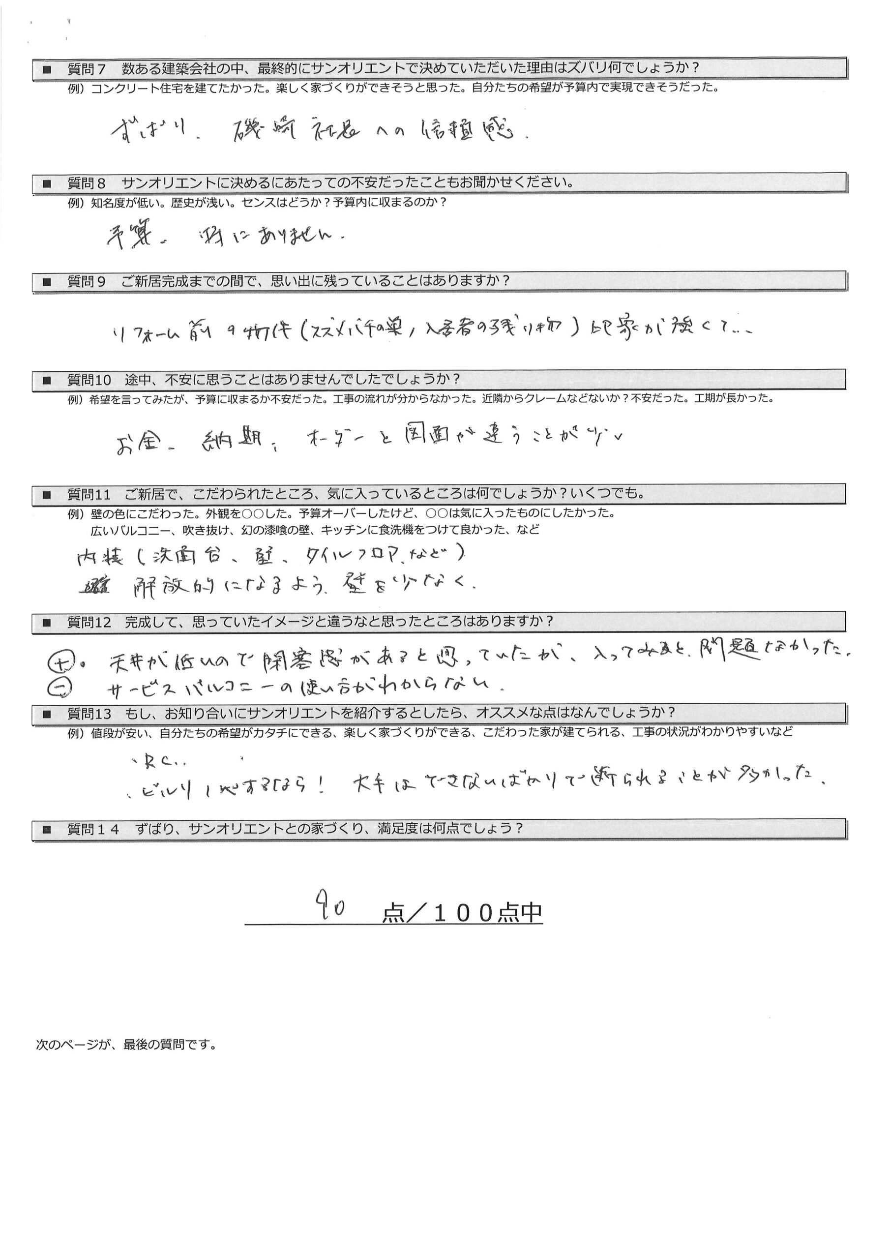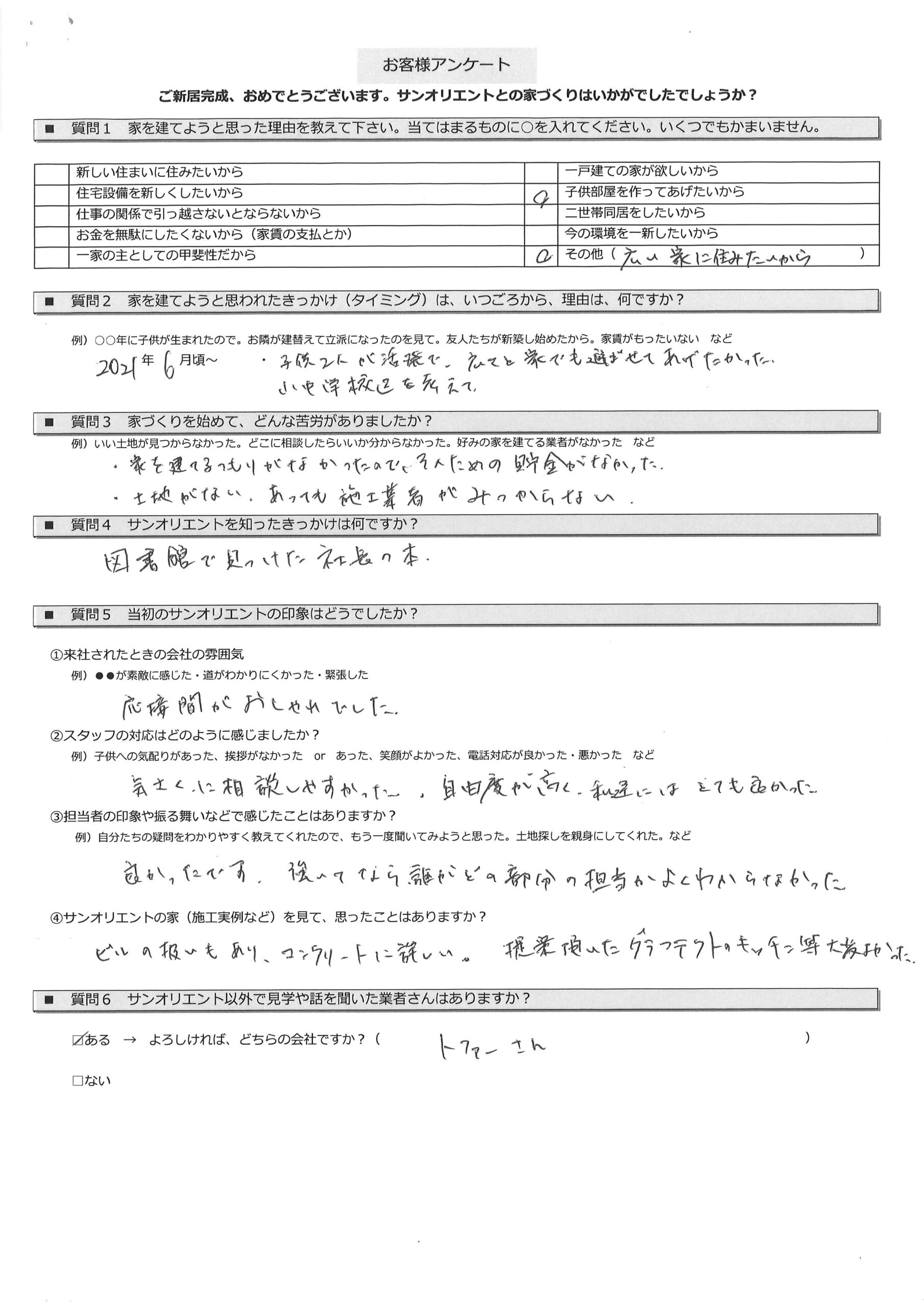 気さくで相談しやすく、自由度が高いことが良かったです。正直言うと、誰が担当者なのかが良く分からなかったことや、こちらの希望が図面に反映されていないなど不安に感じることもありました。